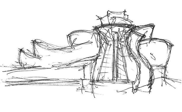 L’enveloppe physique du bâtiment, qui fournit un support structurel, un flux d'énergie, une résistance aux intempéries et une isolation. Alors que le modernisme mettait l'accent sur la pureté de la forme par le biais d'enveloppes simples, droites et ordonnées qui étaient pragmatiques, l'architecture déconstructiviste a riposté avec des enveloppes non rectilignes et souvent déconnectées, des combinaisons complexes de matériaux et un mépris presque total de la protection contre les éléments naturels comme la lumière, la chaleur et même la pluie.